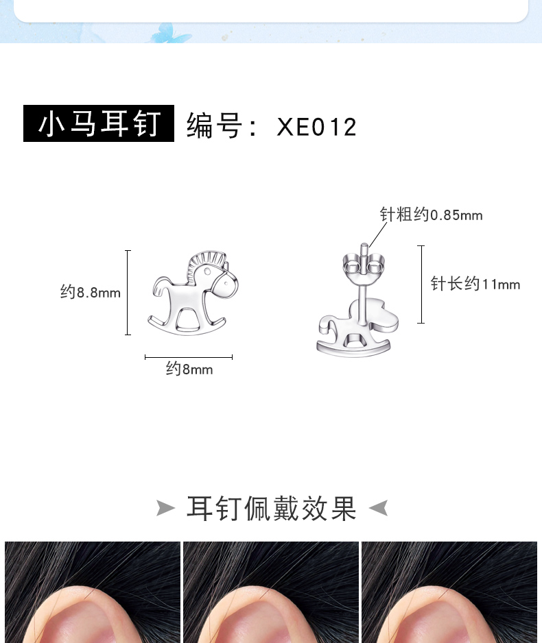 XE012小马耳钉白金色一对*1.1g
